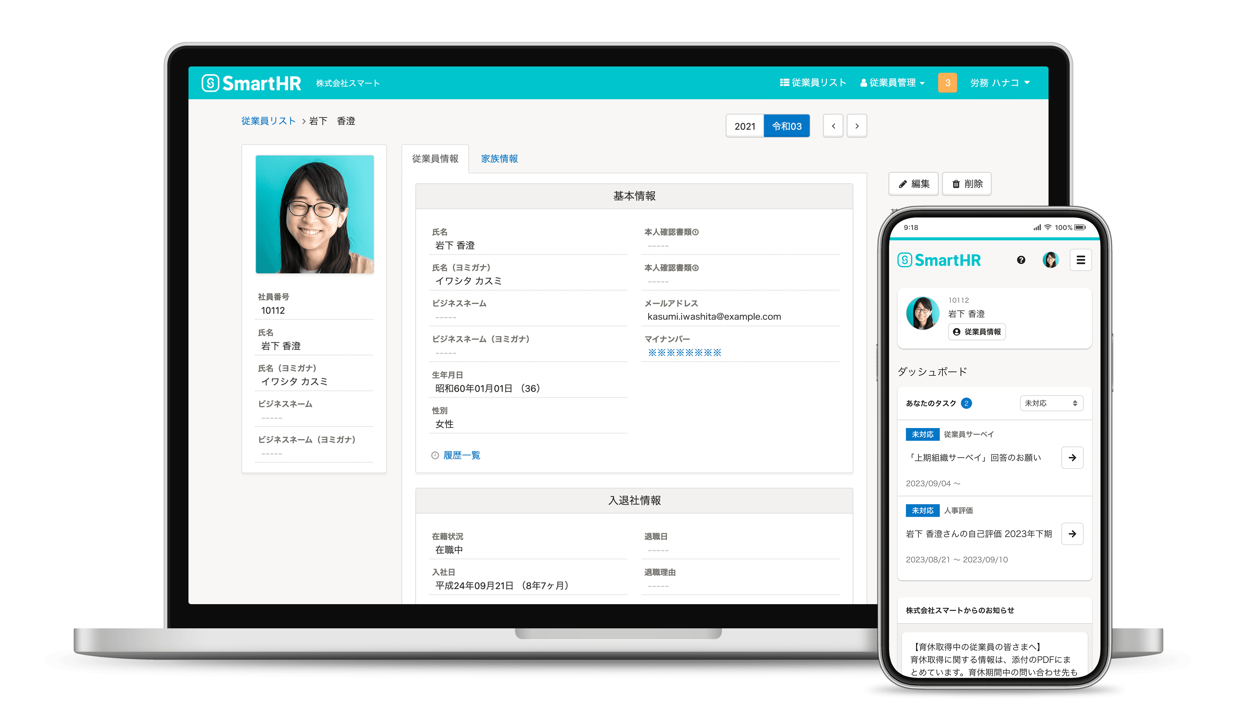 (使用キャプチャ: SmartHR本体 従業員情報詳細(管理者)| Google ドライブ・SmartHR基本機能 SmartHRのホーム フォーマル スマートフォンサイズ)