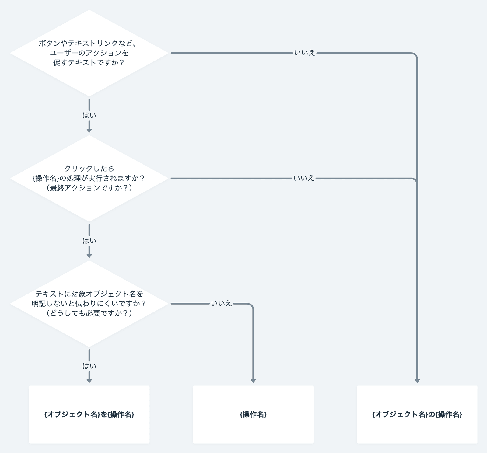 ラベルは、そのボタンが担うアクションを体言止めで書きます。