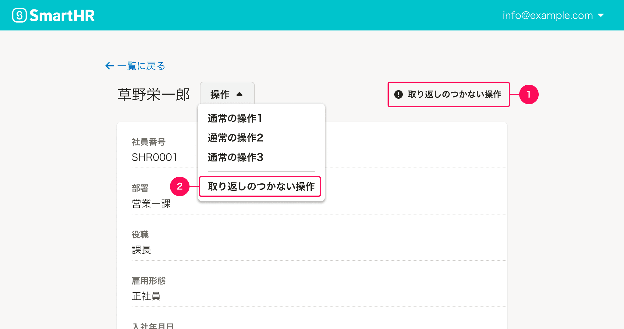 取り返しのつかない操作をボタンなどのコンポーネントで提供する際は、ユーザーの誤操作を防ぐために可能な限りメイン操作領域の遠くに置く(1)、または領域を変更して置くこと(2)を推奨します。