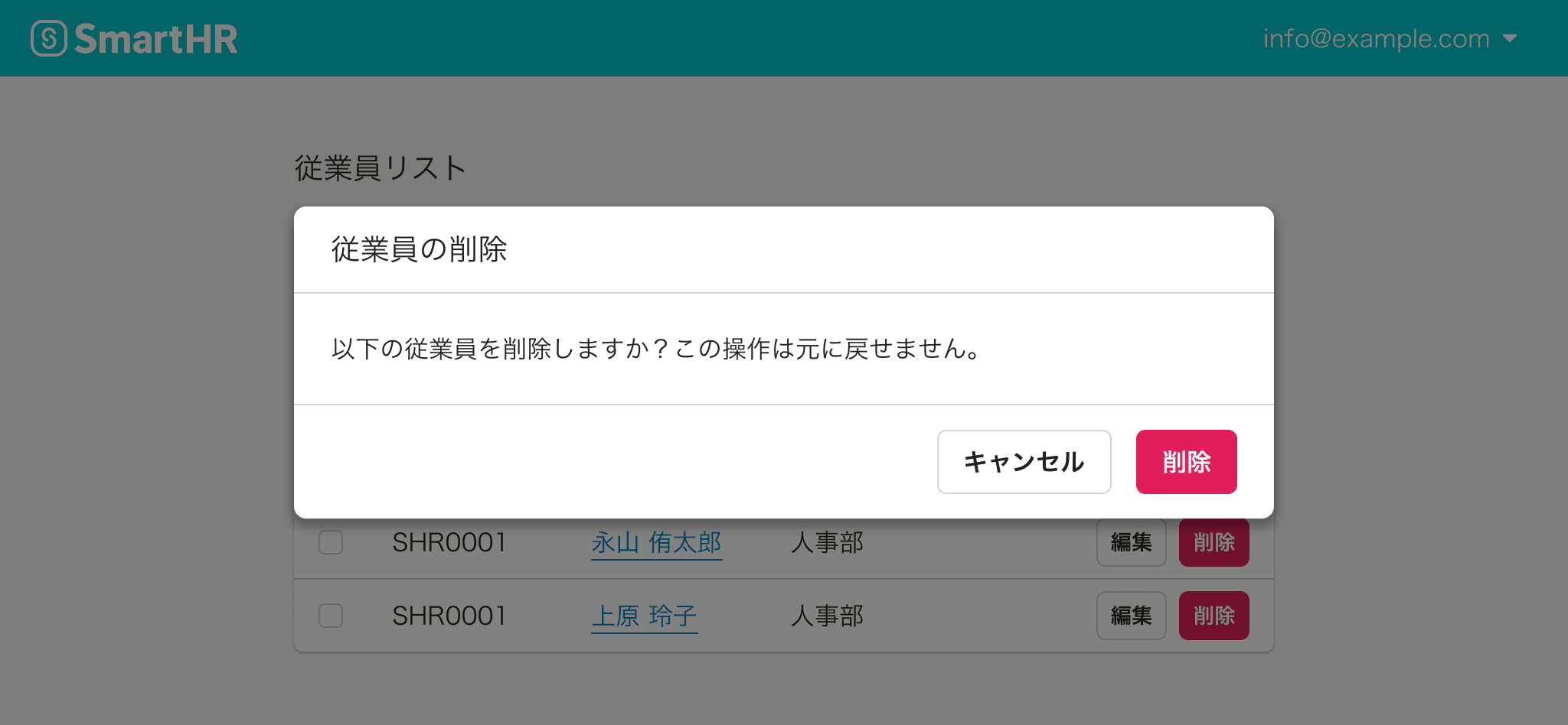 取り返しのつかない操作をユーザーが実行した際は、その操作によって何が起こるのかをフィードバックで伝えましょう。 フィードバック方法としては、削除ダイアログをはじめとした確認ダイアログなどを表示するのが良いでしょう。